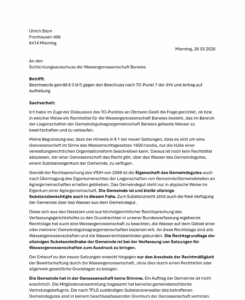 Andrerseits wurden von der Wassergenossenschaft Barwies in der JHV neue Satzungen beschlossen, die ebenfalls auf der rechts- und verfassungswidrige Substanznutzung des Gemeindegutes beruhen. In diesem Fall ist ein Widerspruch erfolgt, der nun durch eine Beschwerde beim Schlichtungsausschuss der Wassergenossenschaft eingebracht wurde.