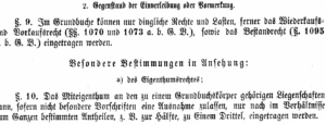Für die gemeinschaftliche Nutzung von Grundbuchskörpern gab es zum Zeitpunkt der Grundbuchsanlegung nur zwei grundsätzliche Möglichkeiten: Einerseits die Nutzung von privatem Gemeinschaftseigentum oder andrerseits die Nutzung von Gründen, die sich im Eigentum von Gemeinden oder Gemeindeteilen befanden. Die Ausführung der Verbücherung dieser beiden Rechtsformen ist gesetzlich normiert, eindeutig und unverwechselbar.